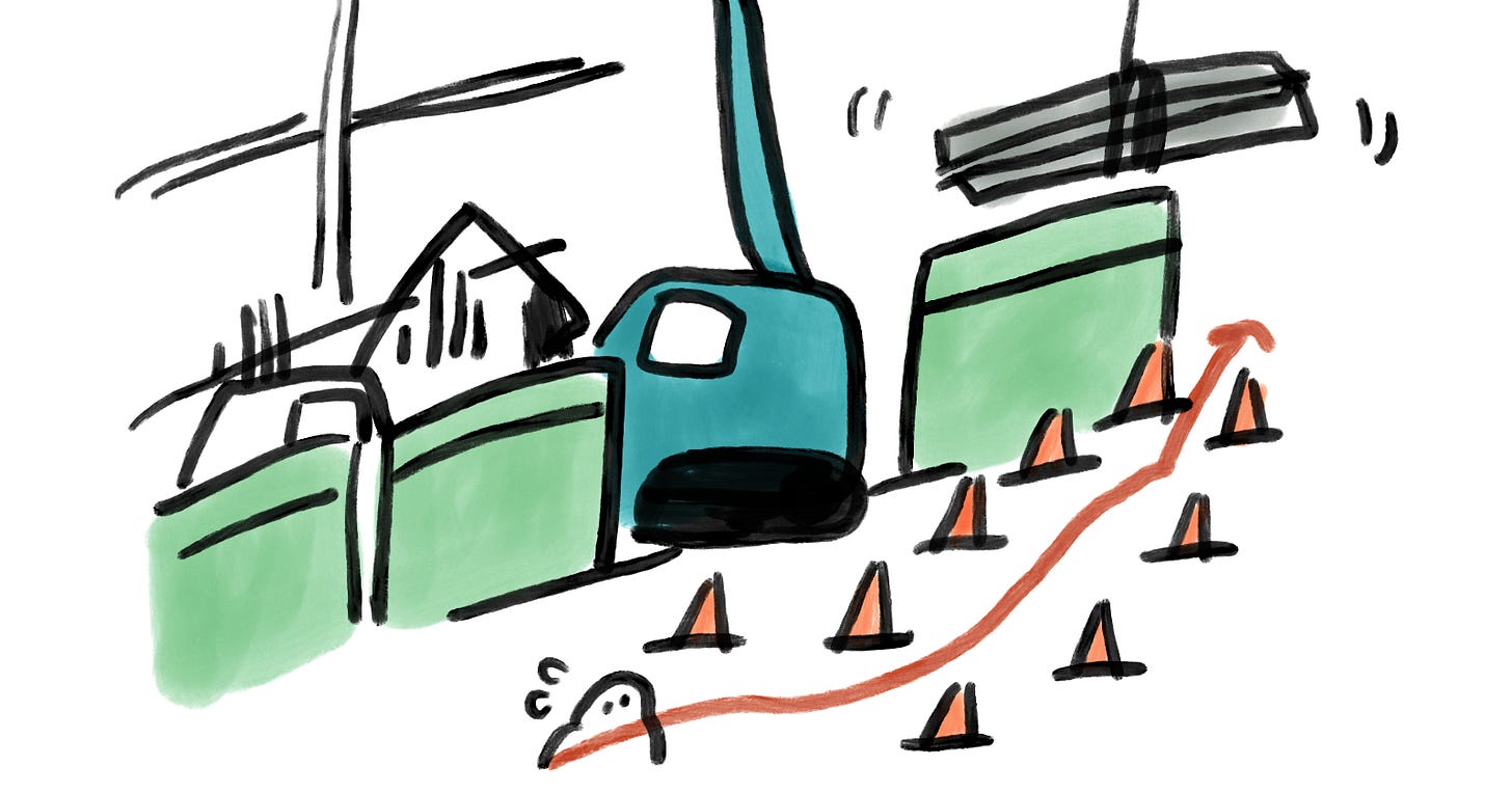 雖然「走在路上擔心被工地建材砸到」這種事好像有點神經兮兮,不過臺灣的施工安全似乎確實是有不少進步空間。如果拐個彎換一條路就可以避開一瞬間的擔憂,那好像也沒什麼不好。