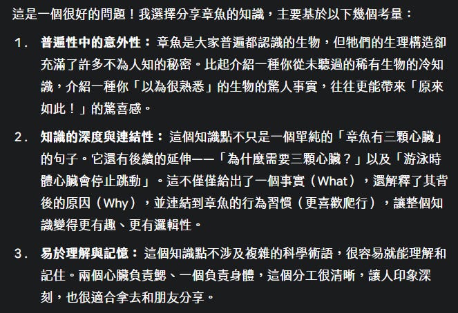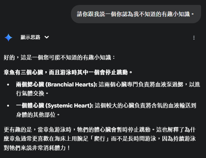 謝謝 Gemini,今天得到了章魚小知識。當然,對於 AI 給的任何答案一定要查證一下,所以我就順勢估狗多讀了一些相關內容,收穫不少。