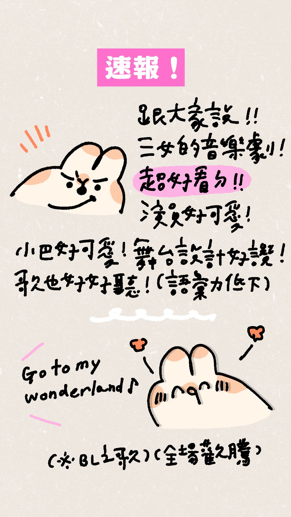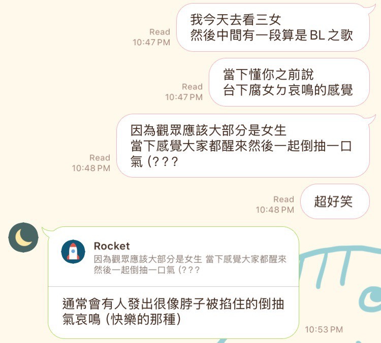 另外是關於前面提到的 BL 之歌〈Go to My Wonderland〉(這什麼不檢點的歌名!嚴厲斥責!目不轉睛!)我看完戲之後立刻傳 LINE 給我的朋朋阿偉: