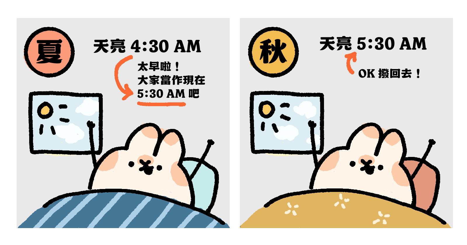 到了秋天,因為天亮時間變晚了,就再把時間調回去,大家才不用摸黑出門。