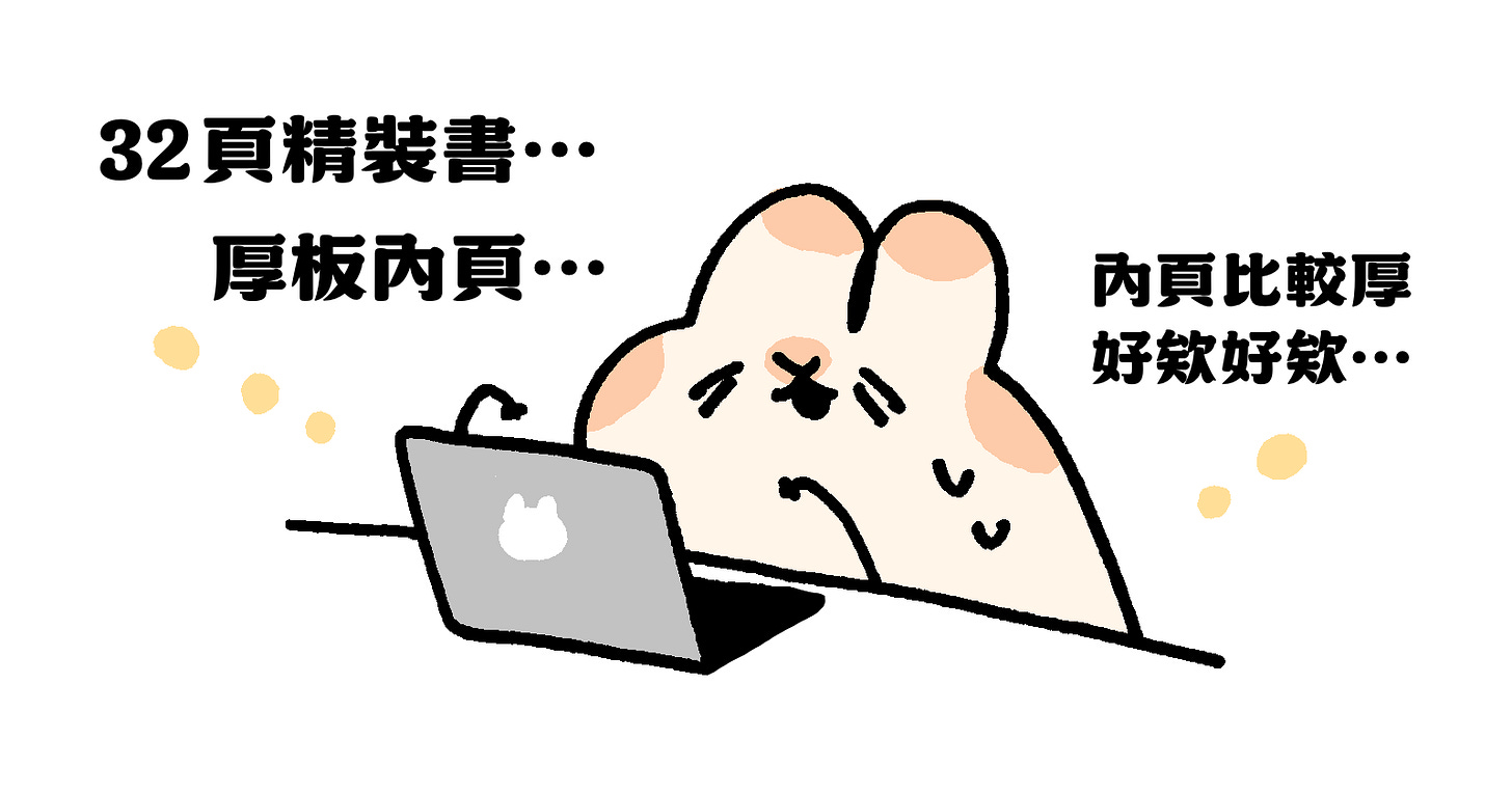 我找了最常用的網路印刷服務,看看規格,選了精裝、正方形、32 頁,還有內頁比較厚的版本,想說厚一點的內頁比較有質感,完美!