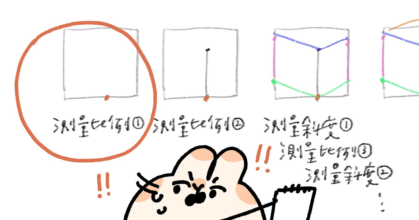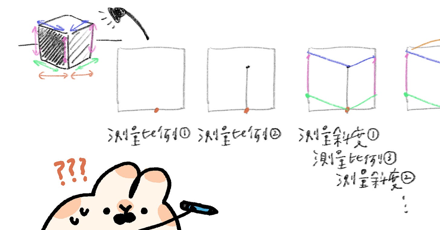 最有趣的是,其實最開始這個量壞的比例,偏差並沒有想像中巨大。正是因為它小小的,一開始畫起來才會覺得「好像沒問題喔!」,然後每一次下筆,又多累積了一點點偏差,最後走了很遠、想起要檢查的時候,正方體已經變成長方體了。