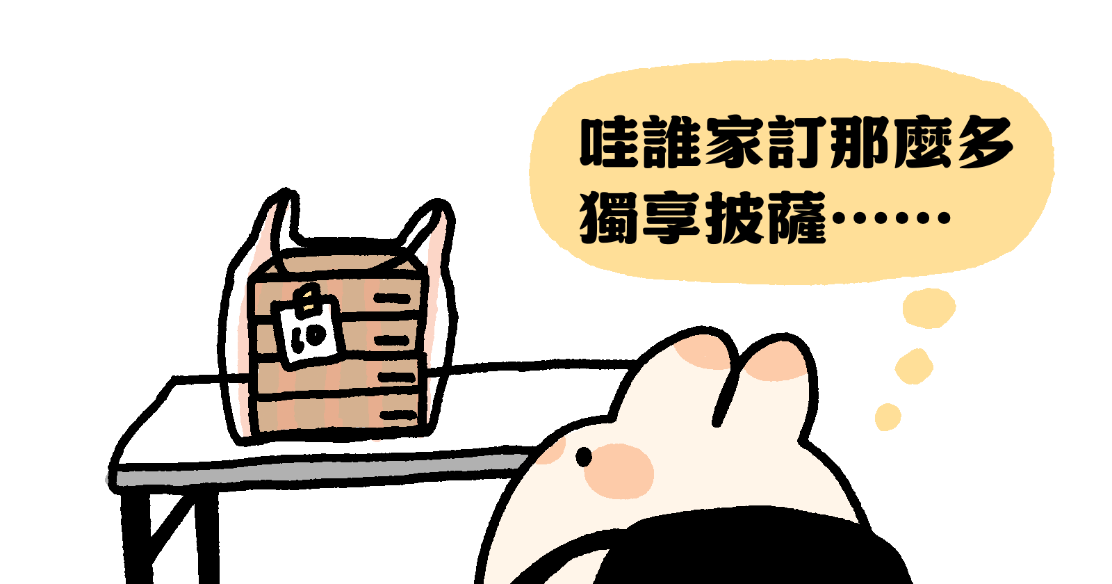 送印之後我就沒有太在意,結果隔幾天回家的時候,我在大樓的外送桌看到有一袋裝了四個獨享披薩的大塑膠袋。