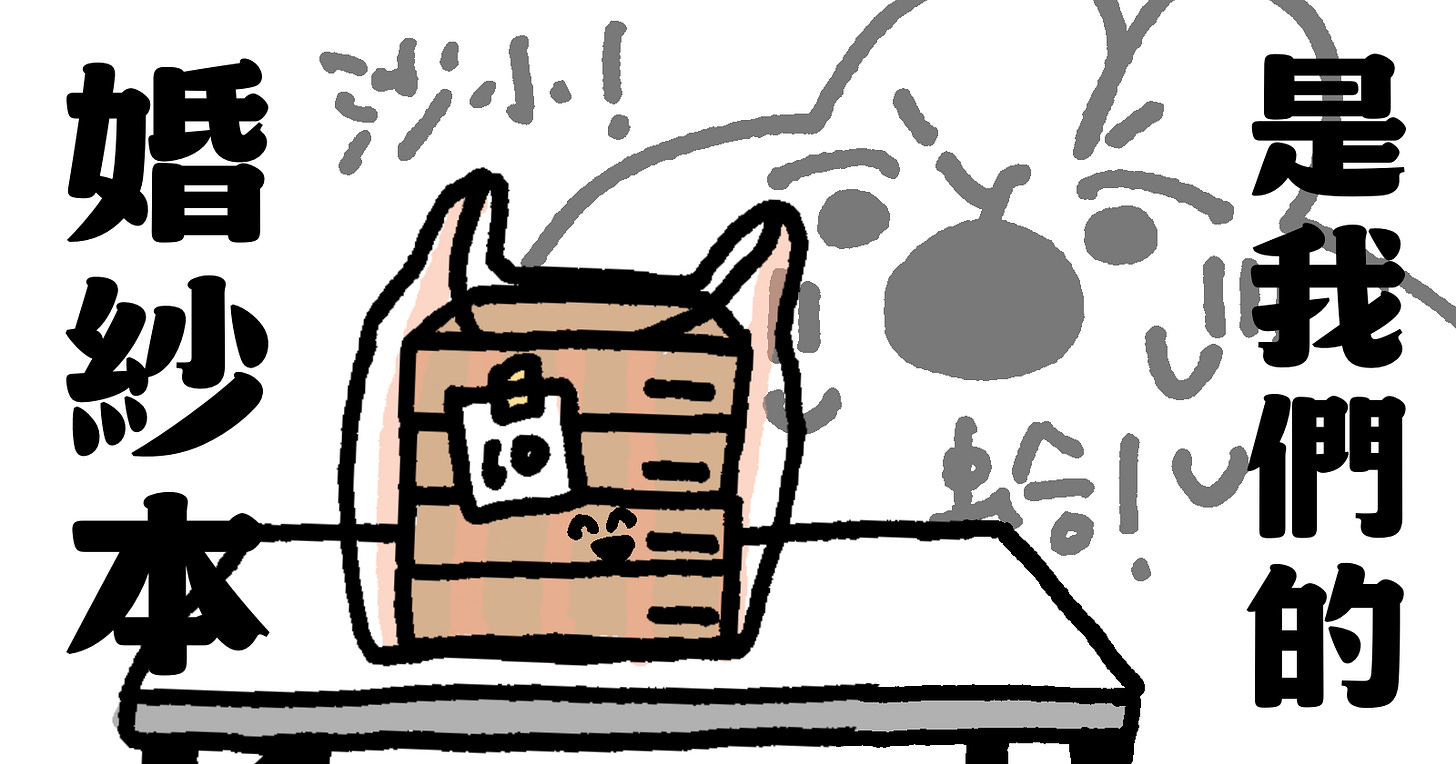 總之一切從我想像中的可愛繪本,變成超好笑的披薩盒 style 古早味婚紗本,只差照片本身沒有加上復古柔焦哈哈哈哈哈。其實整體還是滿讚的啦,但就,哈哈哈哈哈哈哈哈。